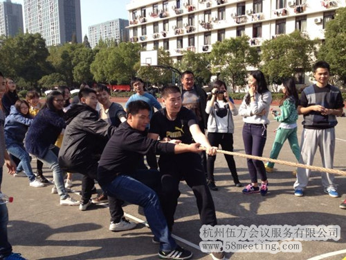 現(xiàn)在進入了激烈的拔河比賽中,雙方隊員都在齊心協(xié)力,圍觀人員都在為隊員加油,比賽真是難分勝負啊。