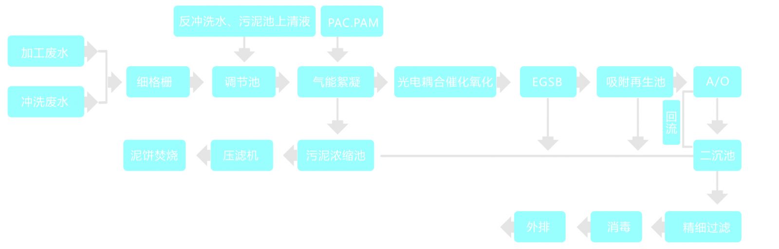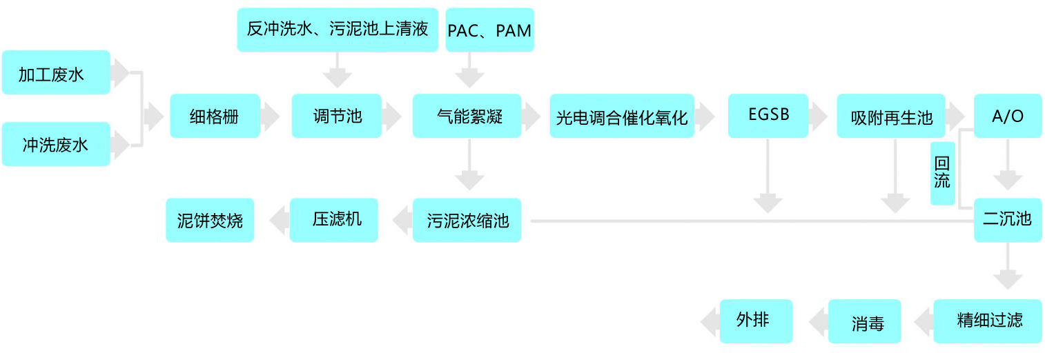 加工廢水和沖洗廢水混合經細格柵去除大的浮渣后進入調節池,投加絮凝劑后提升至氣能絮凝池以去除污水中的懸浮物及油脂。出水進入三維粒子光電耦合催化氧化反應器,以可見光為光源,通過羥基自由基與廢水中高濃度的有機物的加成、取代、電子轉移等反應使大部分污染物轉化為二氧化碳、水等簡單無機物,從而提高廢水的可生化性。出水提升到EGSB反應器進行厭氧反應,大大降低COD負荷,然后經吸附再生池提高其生物活性后進入A/O系統,通過缺氧段和好氧段的交替運行高效脫氮。出水進入二沉池固液分離,其上清液經精細過濾系統、消毒后外排。