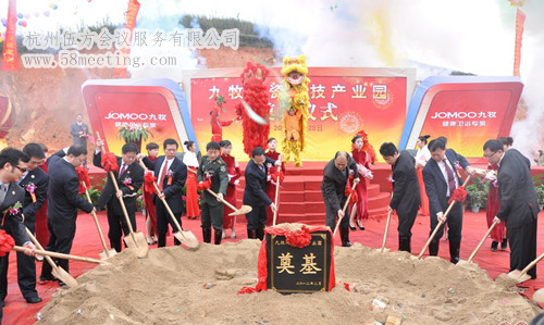 通常,伍方會議服務在舉辦奠基儀式的時候會在現場應設立彩棚,安放該建筑物的模型或設計圖、效果圖,并使各種建筑機械就位待命。還應奏響鑼鼓,或演奏喜慶樂曲。首先由奠基人雙手持握系有紅綢的新鍬為奠基石培土。隨后,再由主人與其他嘉賓依次為之培土,直至將其埋沒。